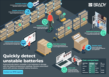 Detekujte automaticky nestabilné lítium-iónové batérie v sklade pomocou najrýchlejšieho merania teploty. Vyhnite sa prerušeniam prevádzky s nákladovo efektívnym riešením, ktoré súčasne umožňuje automatizovanú inventarizáciu batérií.